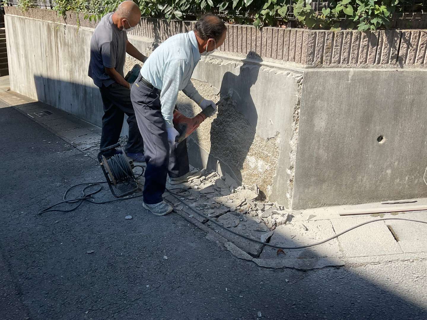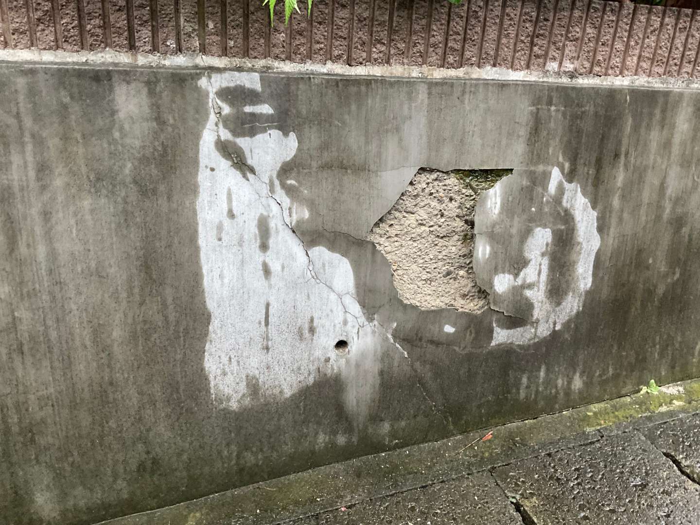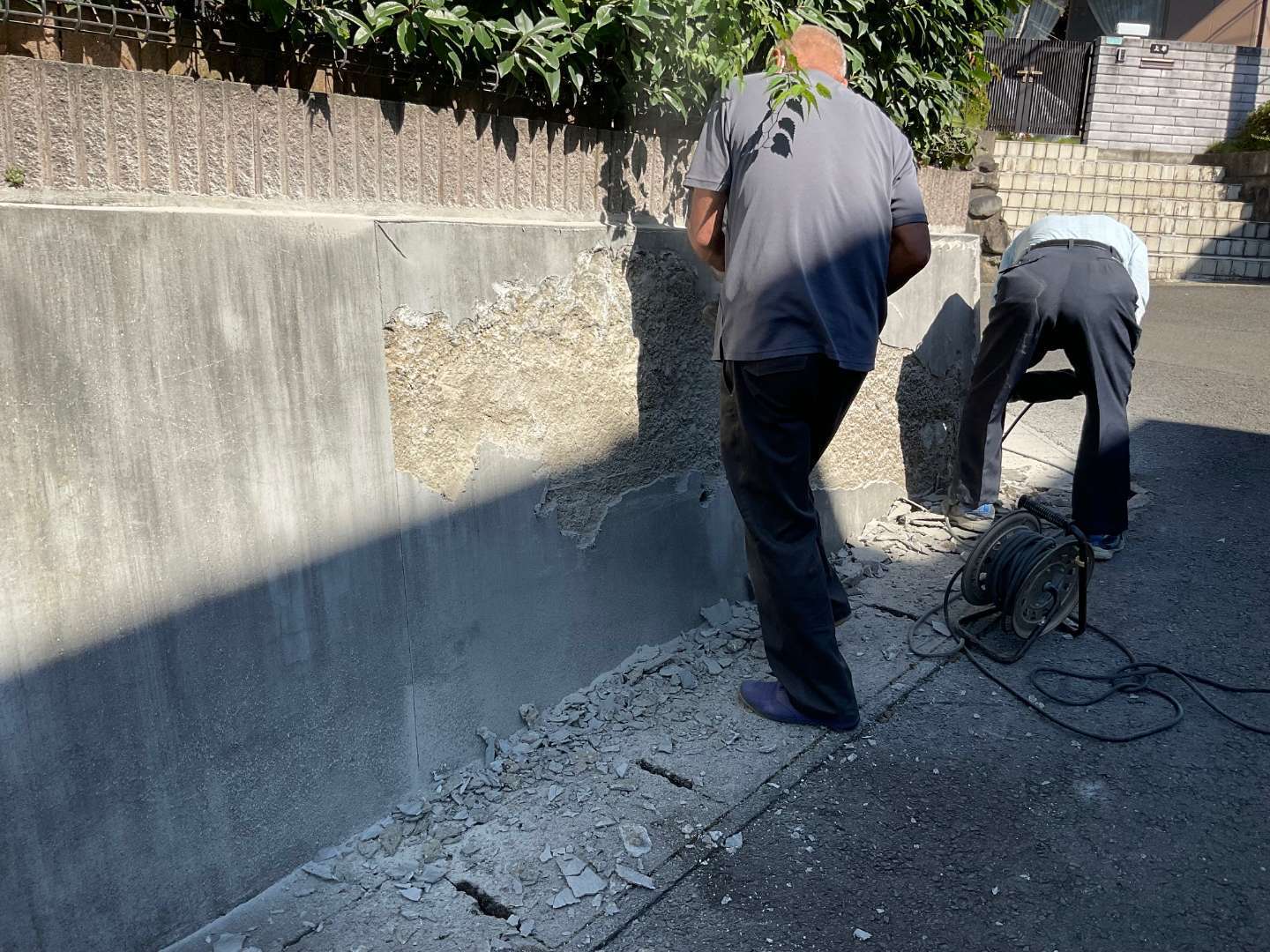 擁壁のモルタルが割れ剥がれてきており、コンクリートまでは壊れてないのを確認しました。